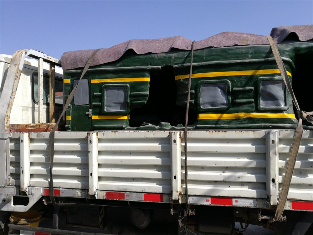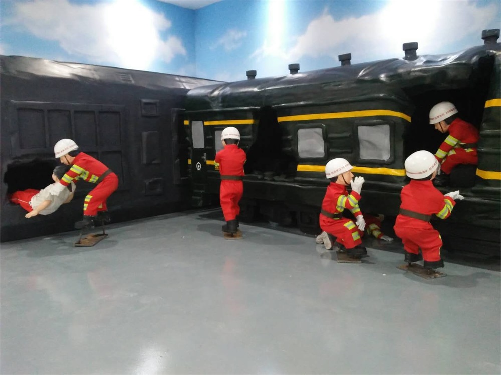 雕塑說明:雕塑整體場景以發(fā)生在淄博市境內(nèi)的一場火車碰撞事故救援現(xiàn)場為題材?;疖嚹P筒捎门菽袼芄に囍谱鳎砻娌世L。消防人物雕塑采用玻璃鋼雕塑工藝制作。
